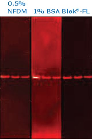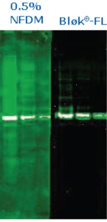 封闭印迹膜上所有非特异性结合位点对于避免高背景至关重要。蛋白类的封闭剂,如脱脂奶,覆盖在膜表面,本身会与抗体发生非特异性结合。而且由于蛋白降解、微生物污染等容易使这些封闭剂变质,而造成性能不稳定。Bløk®-FL这样的无蛋白化学试剂作为封闭剂不会像牛奶一样在膜表面形成厚而粘稠的一层,对降低背景非常有效。
