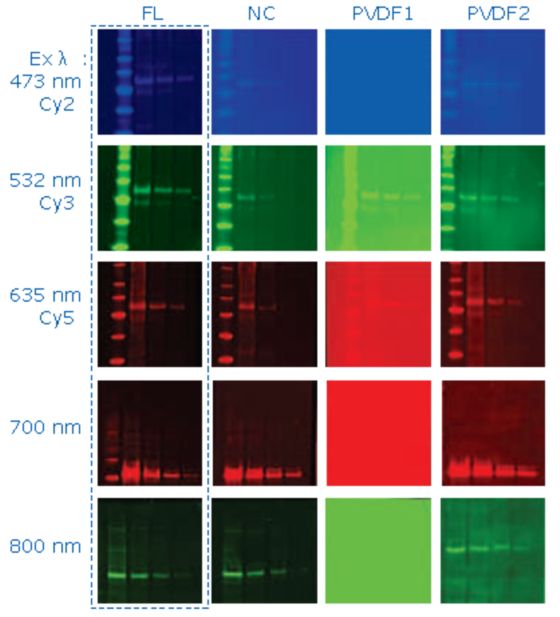 直到……直到Millipore的Immobilon®-FL荧光检测专用PVDF上市(请见图中最左侧一列)。