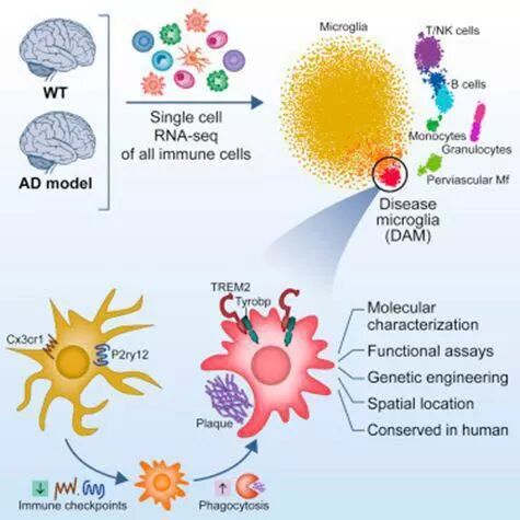 2017年,IdoAmit团队在大脑中发现一种新型免疫细胞——disease-associatedmicroglia(DAM),证实DAM细胞负责降解死亡的细胞以及与阿尔兹海默症相关联的蛋白病斑。研究人员强调,只有对单个细胞进行RNA测序才能发现罕见的小胶质细胞,从而为治疗包括阿尔兹海默症等在内的神经类疾病提供新方法。