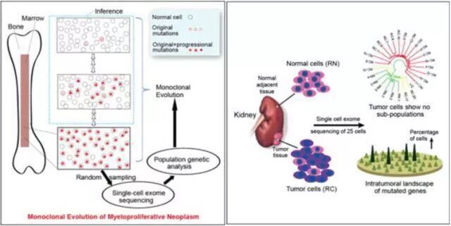 2012年3月2日,国内某基因研究院在肿瘤研究上获得突破性进展,于国际著名学术期刊《细胞》(Cell)上同时发表两篇研究论文。该工作研发了一种解析单细胞基因组的新方法,并将该方法应用于原发性血小板增多症(一种血癌)和肾透明细胞癌(一种肾癌)(图3)的肿瘤内部遗传特征研究。此新方法解决了之前无法解决的肿瘤高异质性难题,为深入研究癌症发生、发展机制及其诊断、治疗提供了新的研究思路并开辟了新的研究方向。