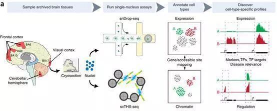 2018年初,张鹍教授团队在NatureBiotechnology上发表了一个基于全新单细胞核测序方法的成年人脑第二代单细胞图谱。该研究通过结合基于微流体的单核测序(snDrop-seq)和单细胞转座体超敏性位点测序(scTHS-seq)的方法,不仅能利用转录组学分析鉴定不同功能的细胞类型,还能通过表观遗传学特征更好描述这些表达图谱是如何调节或者维持的。该研究检测了超过60,000个来自成人大脑皮层和小脑的单细胞,发现了35种不同的神经元和神经胶质细胞亚型。并且发现了这些细胞中哪些亚型更易受到不同脑部疾病常见危险因素的影响。